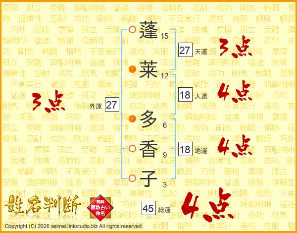 蓬(15画)莱(12画) 多(6画)香(9画)子(3画)