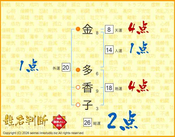 生活面を象徴する運勢です。外部から受ける影響力を表し、結婚運、家庭運や職場、環境への順応性を表します。総運から人運を引いた画数。姓や名が1文字の場合を除く。