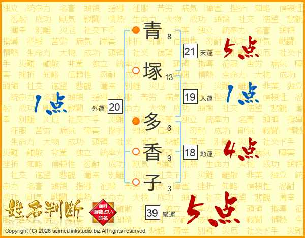 青(8画)塚(13画) 多(6画)香(9画)子(3画)