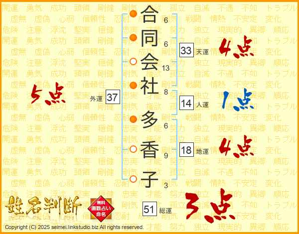 合(6画)同(6画)会(13画)社(8画) 多(6画)香(9画)子(3画)