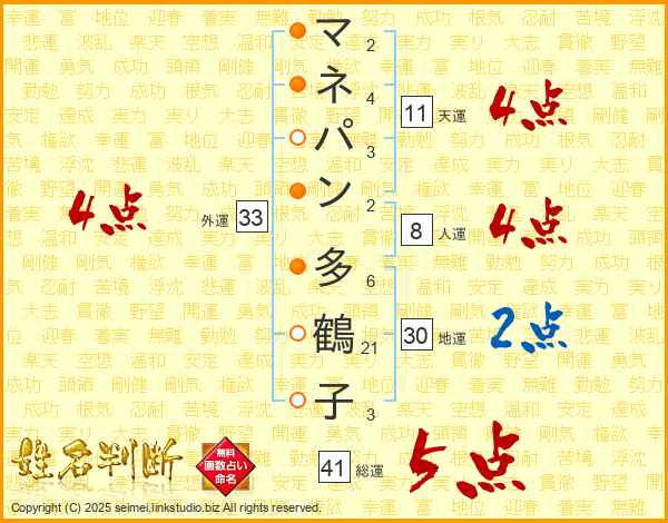 マ(2画)ネ(4画)パ(3画)ン(2画) 多(6画)鶴(21画)子(3画)