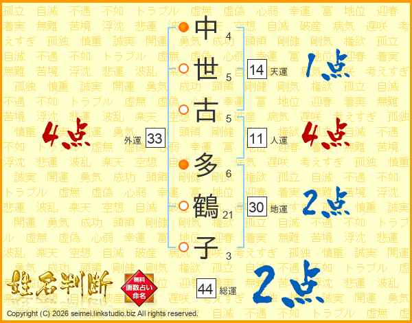 中(4画)世(5画)古(5画) 多(6画)鶴(21画)子(3画)