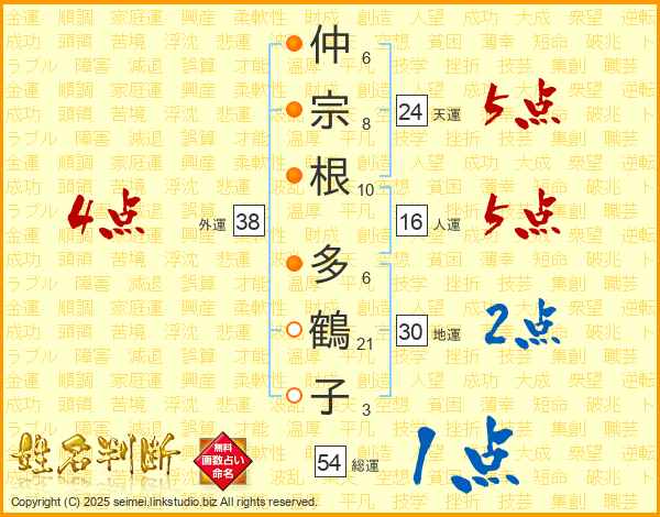 仲(6画)宗(8画)根(10画) 多(6画)鶴(21画)子(3画)
