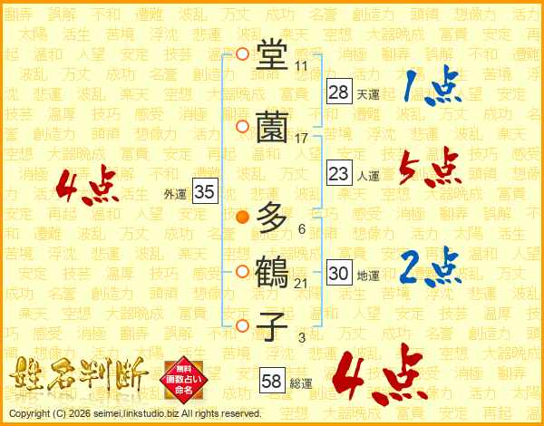 堂(11画)薗(17画) 多(6画)鶴(21画)子(3画)