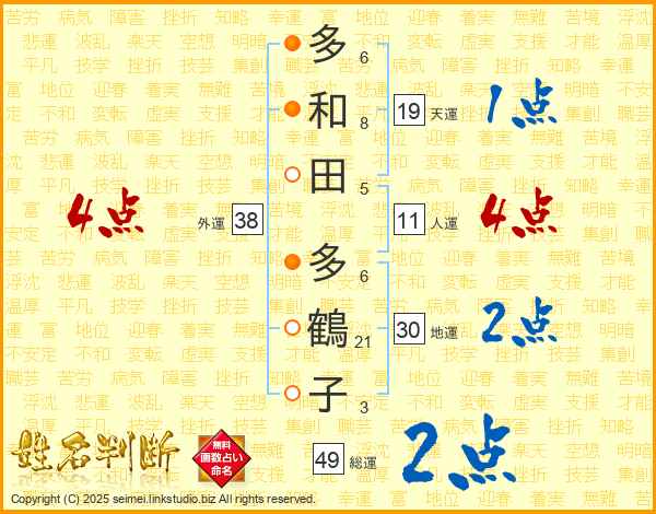 多(6画)和(8画)田(5画) 多(6画)鶴(21画)子(3画)