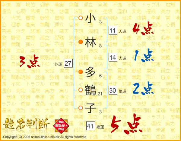 小(3画)林(8画) 多(6画)鶴(21画)子(3画)