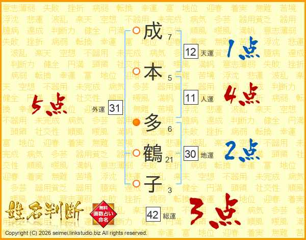 成本多鶴子さんの総運は42画の3点!