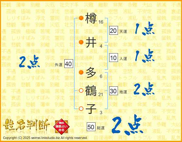 樽(16画)井(4画) 多(6画)鶴(21画)子(3画)