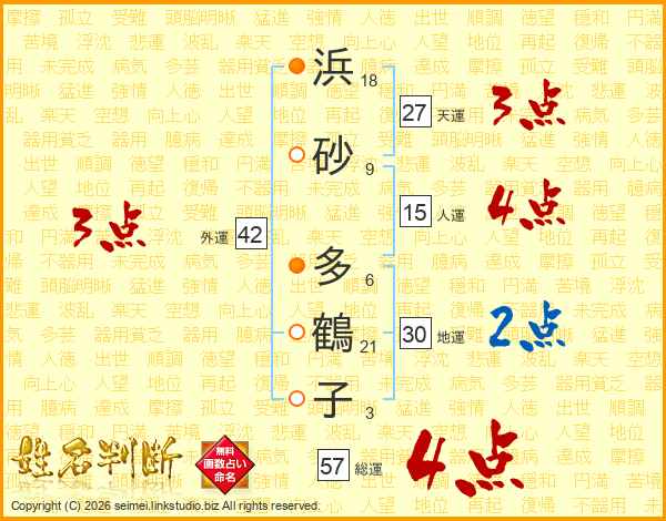 浜(18画)砂(9画) 多(6画)鶴(21画)子(3画)