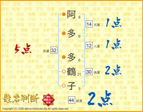 阿(8画)多(6画) 多(6画)鶴(21画)子(3画)