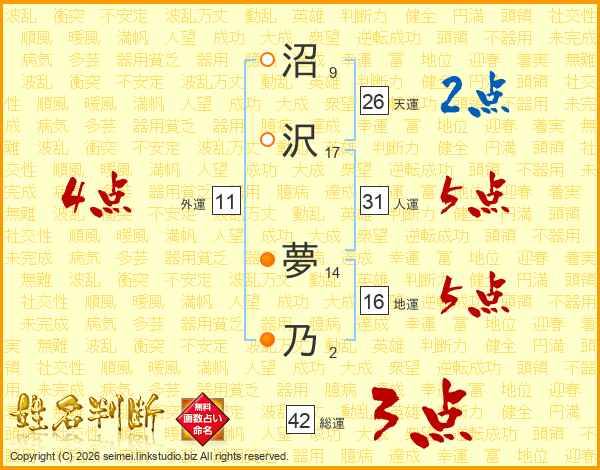 沼(9画)沢(17画) 夢(14画)乃(2画)