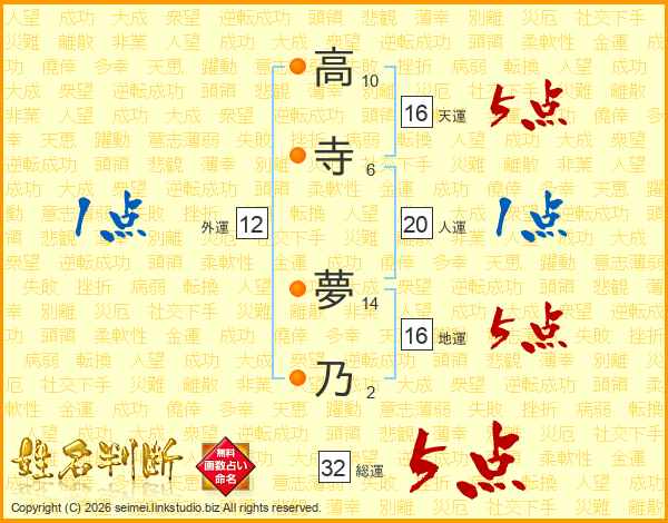 高(10画)寺(6画) 夢(14画)乃(2画)