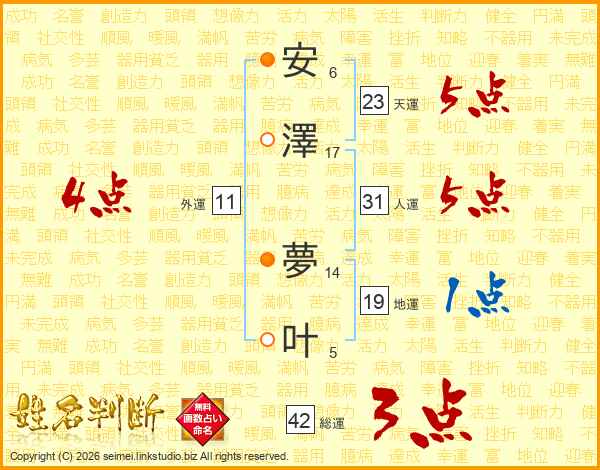 安(6画)澤(17画) 夢(14画)叶(5画)
