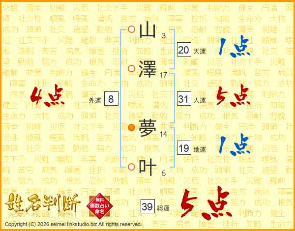 山(3画)澤(17画) 夢(14画)叶(5画)