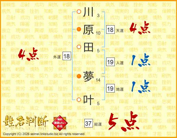 川(3画)原(10画)田(5画) 夢(14画)叶(5画)