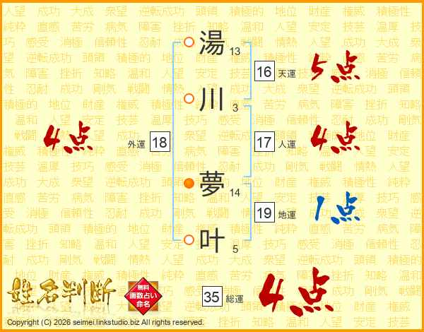 湯(13画)川(3画) 夢(14画)叶(5画)