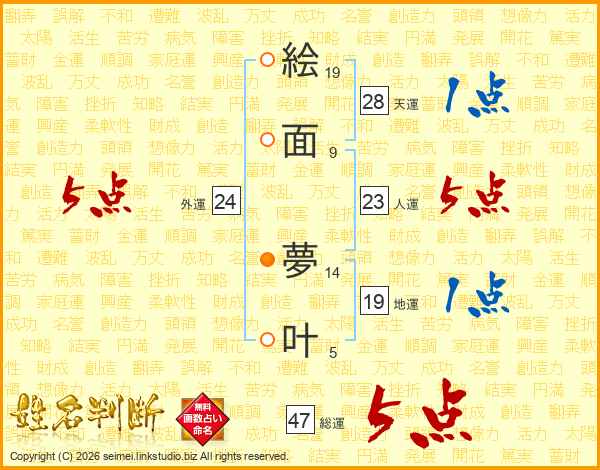 絵(19画)面(9画) 夢(14画)叶(5画)