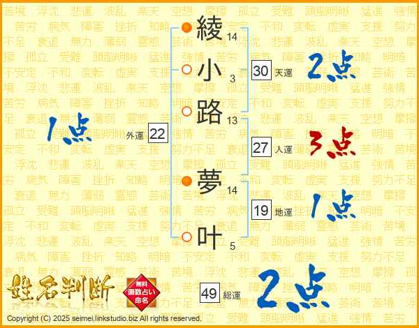 綾(14画)小(3画)路(13画) 夢(14画)叶(5画)