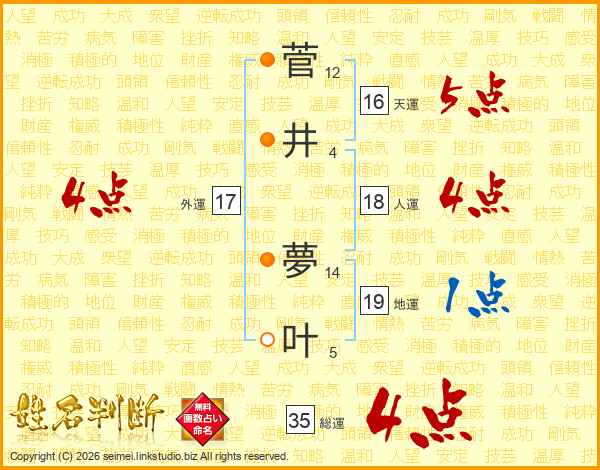 菅(12画)井(4画) 夢(14画)叶(5画)