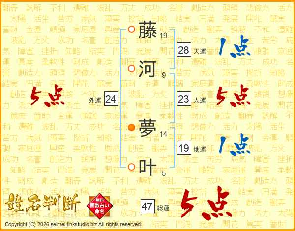 藤(19画)河(9画) 夢(14画)叶(5画)