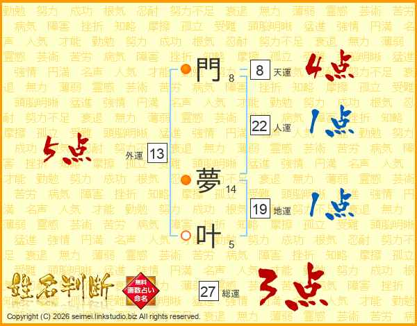 門(8画) 夢(14画)叶(5画)