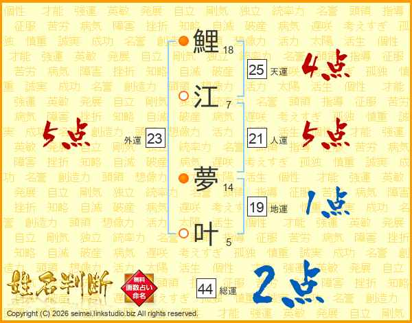 鯉(18画)江(7画) 夢(14画)叶(5画)