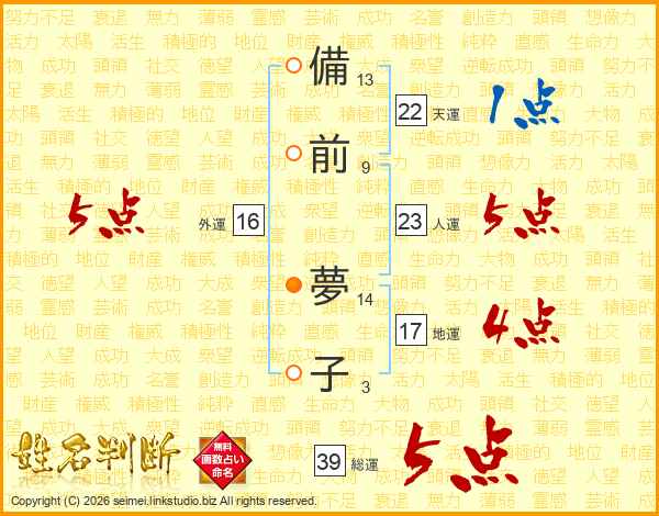 家系が持つ宿命的な運勢を表します。祖先から受け継いだ苗字ですので自分の力が及びません。家柄を象徴します。苗字の合計画数。