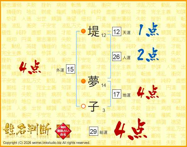 堤夢子さんの総運は29画の4点!
