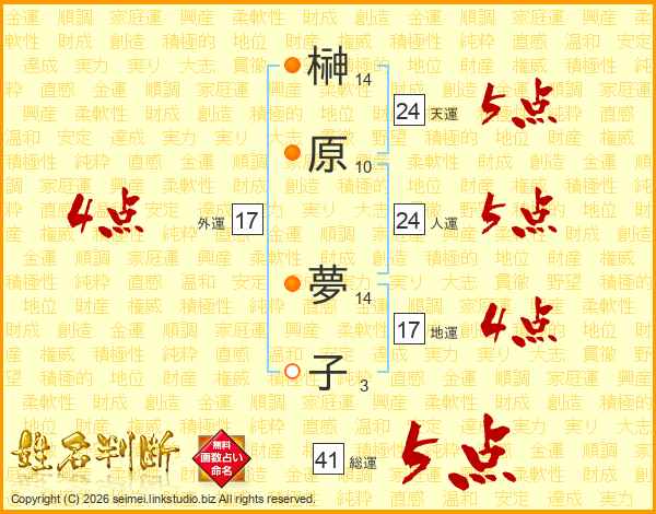 生活面を象徴する運勢です。外部から受ける影響力を表し、結婚運、家庭運や職場、環境への順応性を表します。総運から人運を引いた画数。姓や名が1文字の場合を除く。