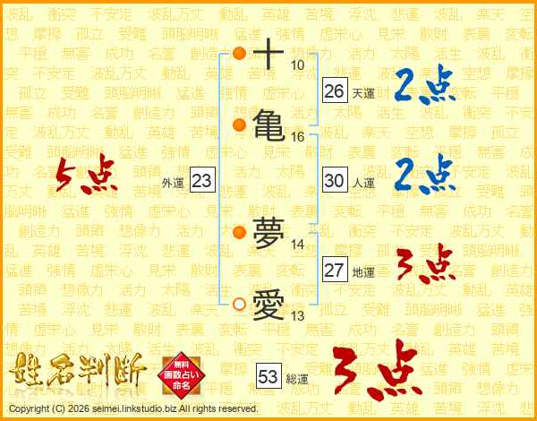 十(10画)亀(16画) 夢(14画)愛(13画)