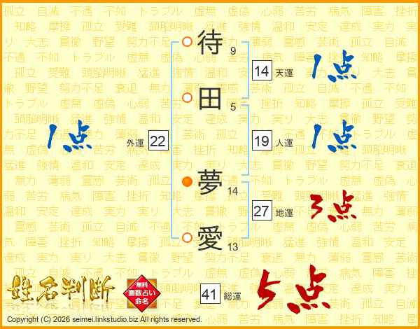 待(9画)田(5画) 夢(14画)愛(13画)