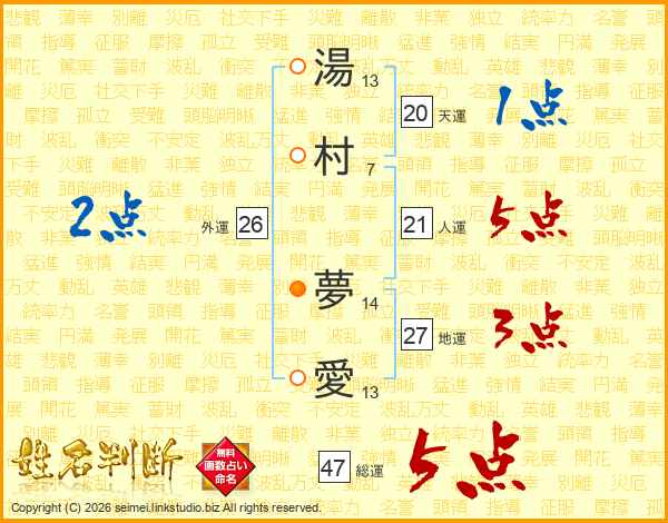 湯村夢愛さんの総運は47画の5点!