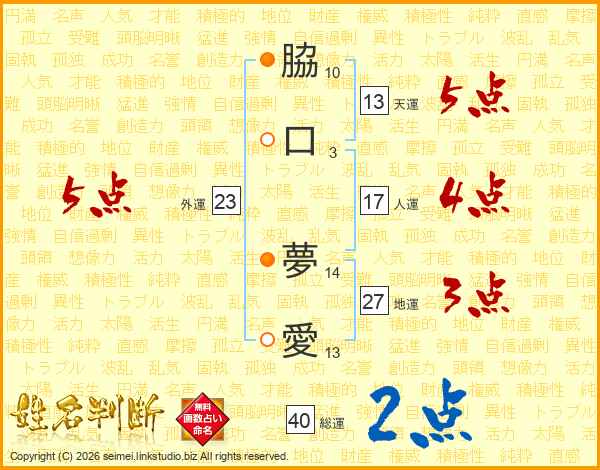 脇(10画)口(3画) 夢(14画)愛(13画)