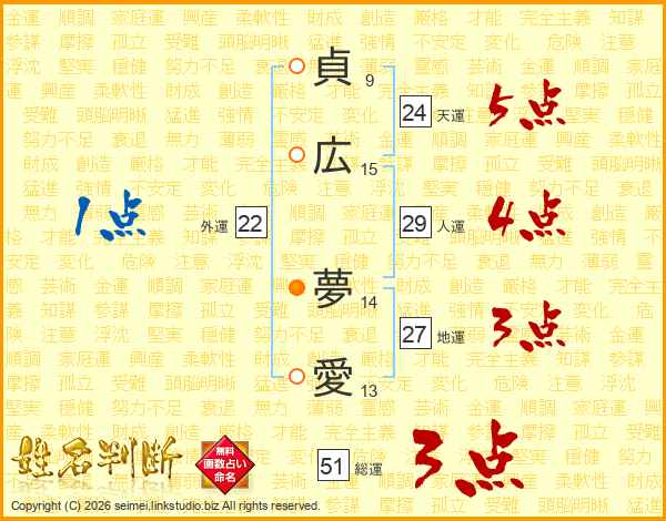 貞(9画)広(15画) 夢(14画)愛(13画)