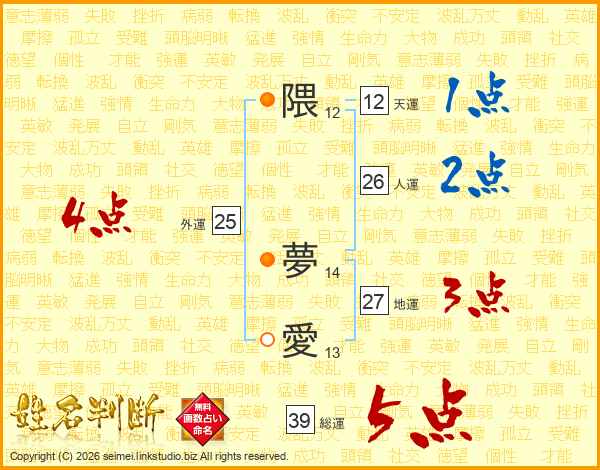 生活面を象徴する運勢です。外部から受ける影響力を表し、結婚運、家庭運や職場、環境への順応性を表します。総運から人運を引いた画数。姓や名が1文字の場合を除く。