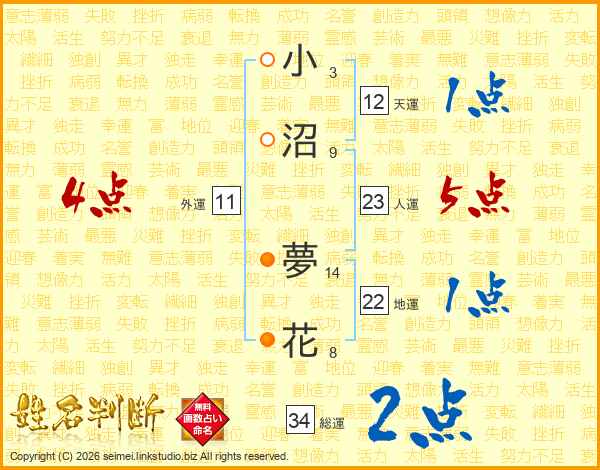生活面を象徴する運勢です。外部から受ける影響力を表し、結婚運、家庭運や職場、環境への順応性を表します。総運から人運を引いた画数。姓や名が1文字の場合を除く。