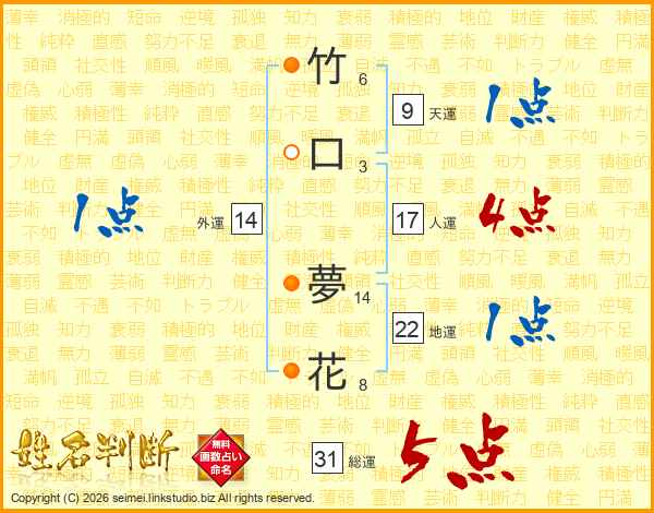 生活面を象徴する運勢です。外部から受ける影響力を表し、結婚運、家庭運や職場、環境への順応性を表します。総運から人運を引いた画数。姓や名が1文字の場合を除く。