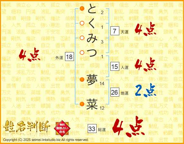 と(2画)く(1画)み(3画)つ(1画) 夢(14画)菜(12画)