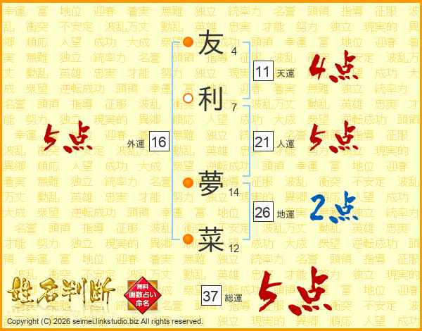 友利夢菜さんの総運は37画の5点!