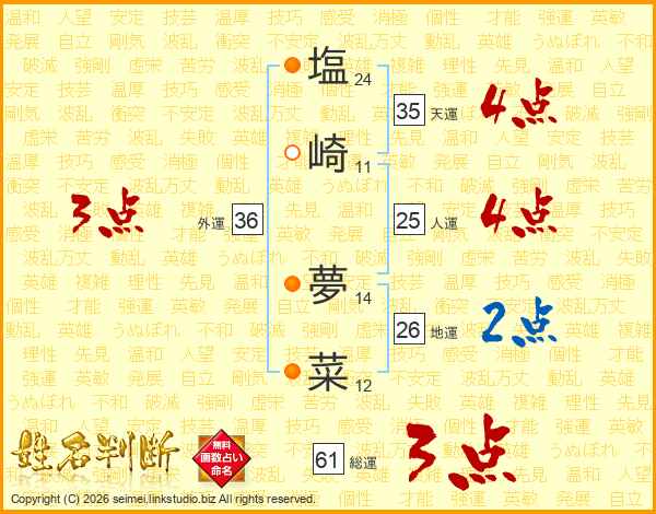 塩(24画)崎(11画) 夢(14画)菜(12画)