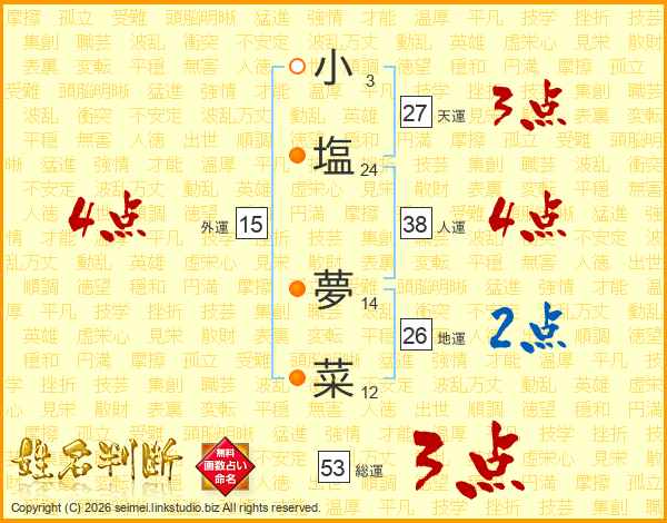 小(3画)塩(24画) 夢(14画)菜(12画)