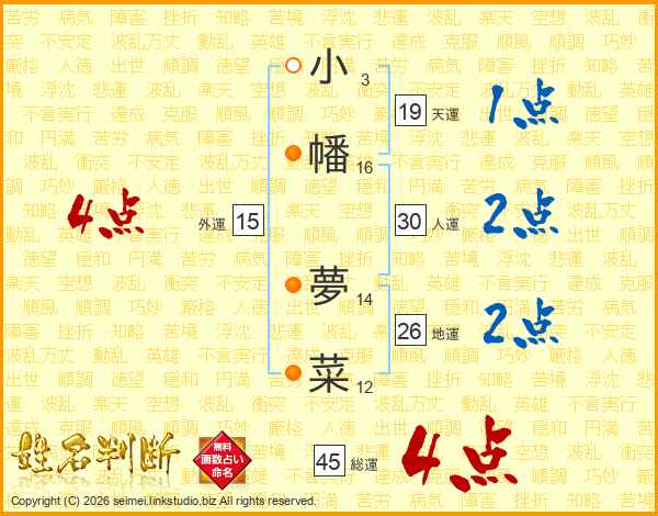 小(3画)幡(16画) 夢(14画)菜(12画)
