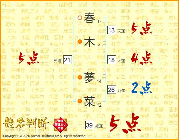 春木夢菜さんの総運は39画の5点!