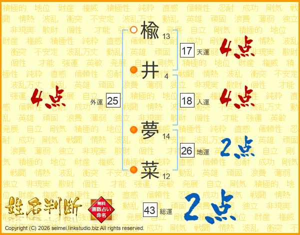 楡井夢菜さんの総運は43画の2点!