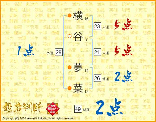 横谷夢菜さんの総運は49画の2点!