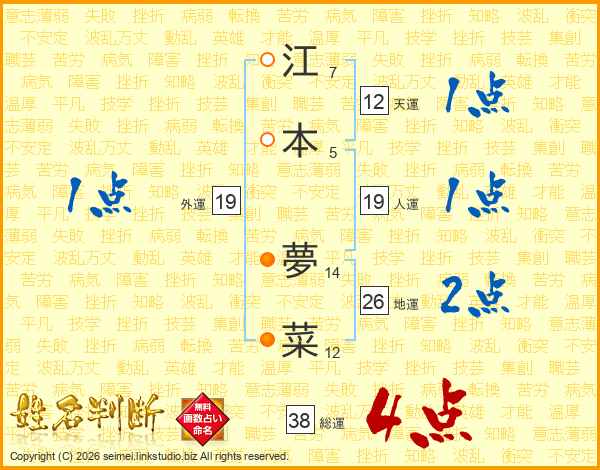 江本夢菜さんの総運は38画の4点!