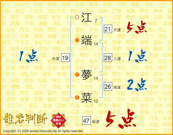 江端夢菜さんの総運は47画の5点!