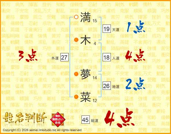 満(15画)木(4画) 夢(14画)菜(12画)