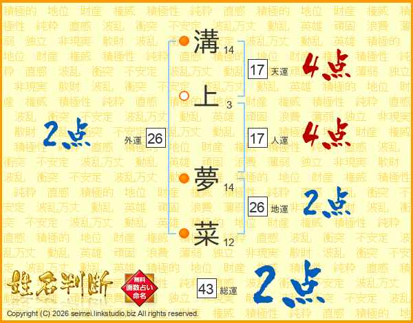 生活面を象徴する運勢です。外部から受ける影響力を表し、結婚運、家庭運や職場、環境への順応性を表します。総運から人運を引いた画数。姓や名が1文字の場合を除く。