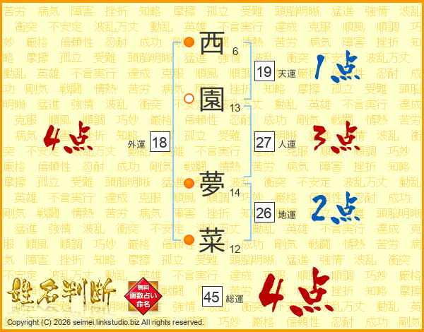 西園夢菜さんの総運は45画の4点!